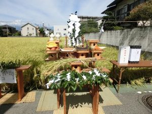 9月2日(土)悠紀田(石田悠遊館の北側にあります)にて抜穂祭がありました。明治神宮より「悠紀の途切れた歴史を2020年明治神宮鎮座100年祭に向け復活させてほしい」との依頼に,ここ石田地区が応え,昨年の新嘗祭において「稲穂」と「お神酒」を奉納することができ,今年も4回目の奉納の準備を進めてきました。石田の歴史再発見事業の地域行事参加協力として5月には,石田小30人近い子ども達がお田植えを行い,弱々しかった苗が,大きな成長をして立派な稲穂になりました。今回は,児童会の代表として5,6年生の子ども達や地域から1年生が抜穂に参加しました。鎌で稲の根元を刈る作業は,見ているとサッと刈っていて簡単そうですが,実際にやってみると,ちからとコツがいって非常に難しいものでした。機械がない時代は,農民が,さぞや大変だったろうと感じました。